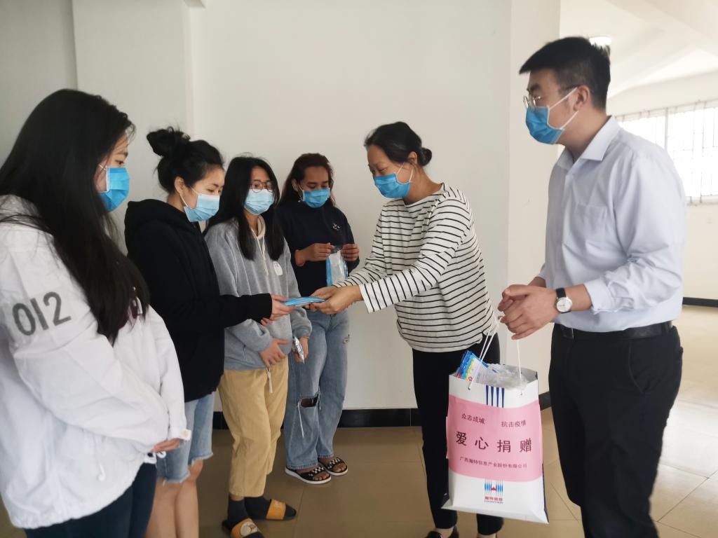4月29日上午,对外交流与合作部部长黄晓玲、外贸与外语系党总支书记李刚深入留学生公寓,看望返校留学生的生活情况并发放疫情防控物资。