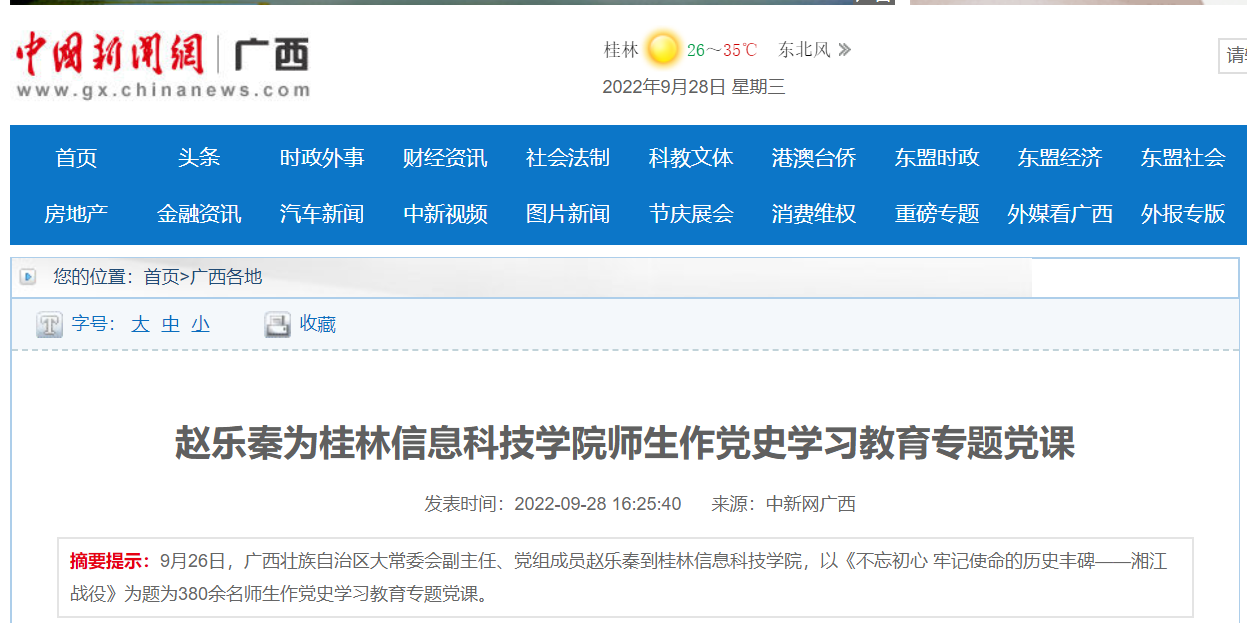 9月26日,广西壮族自治区大常委会副主任、党组成员赵乐秦到永利集团304am登录,以《不忘初心 牢记使命的历史丰碑——湘江战役》为题为380余名师生作党史学习教育专题党课。