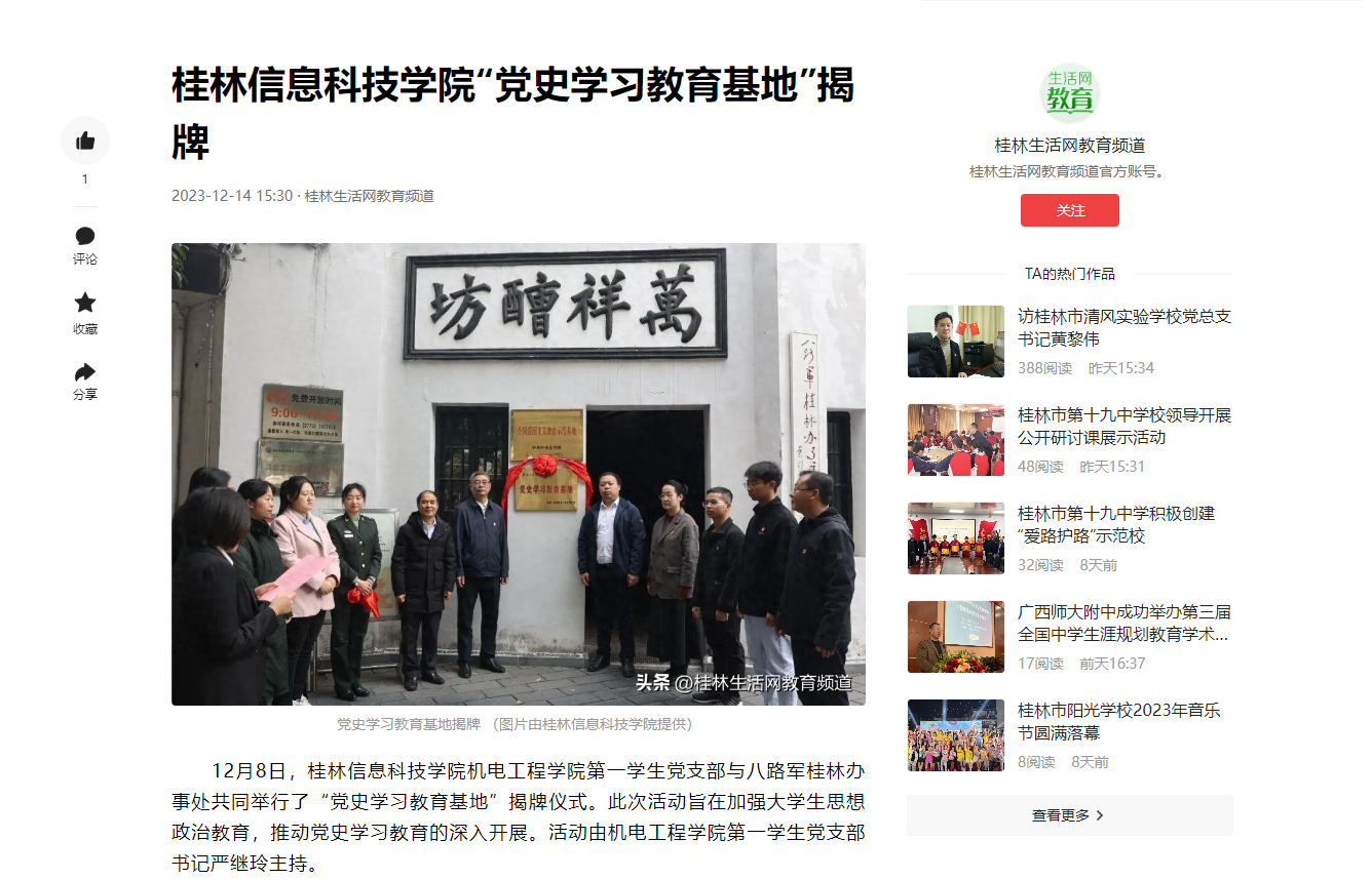 12月8日,永利集团304am登录机电工程学院第一学生党支部与八路军桂林办事处共同举行了“党史学习教育基地”揭牌仪式。此次活动旨在加强大学生思想政治教育,推动党史学习教育的深入开展。活动由机电工程学院第一学生党支部书记严继玲主持。