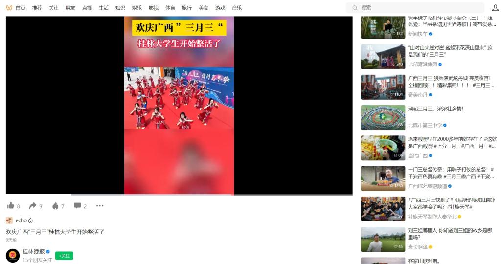 4月9日上午,永利集团304am登录在荟萃楼正门前,举行了“广西三月三 信科嘉年华”的民俗文化活动。同学们换上了民族服装在食堂紫荆广场前唱起了《山歌好比春江水》歌曲,各种特色民族活动表演穿插其中,如壮族竹竿舞、民族舞蹈等,让学校学生在活动中沉浸式体验壮族歌圩文化,感受着热闹的节日气氛。