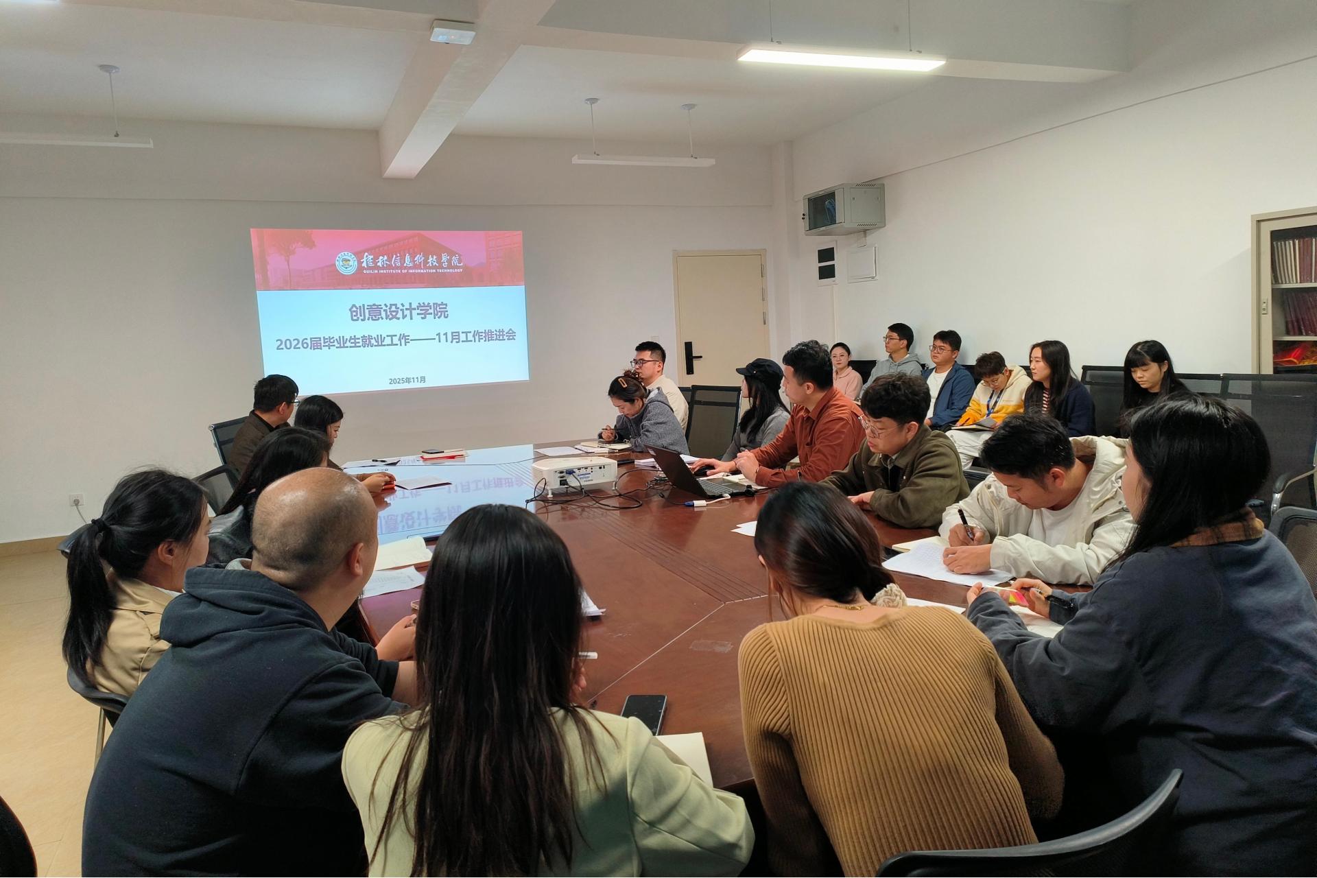 为统筹推进2026届毕业生就业工作,提前谋划就业服务举措,11月5日,创意设计学院在守正楼G517会议室召开11月就业工作推进会。学院党总支书记范恒祯主持会议,院长黄晓瑜、副院长李辉出席,各教研室主任、副主任、辅导员参会。会上,范恒祯书记首先聚焦2026届毕业生就业工作总体规划,从顶层设计层面搭建就业工作框架。他指出,各教研室要压实就业工作指标,细化每月工作清单,从毕业生就业意向摸排,到企业专场招聘筹备、困难...