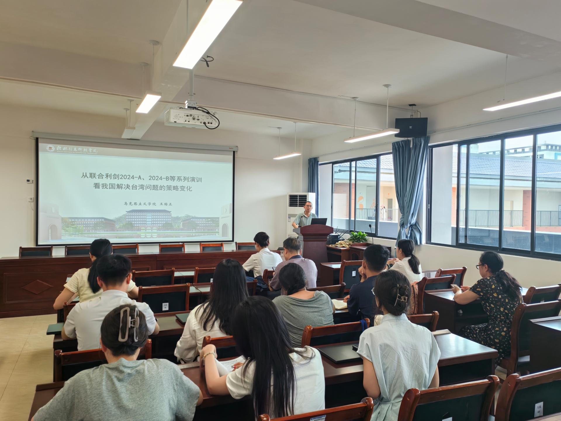 6月27日上午,马克思主义学院的“教授大讲堂”系列讲座在G610会议室顺利举办。本次讲座特邀学院的王贻正副教授担任主讲,他以“深度解读联合利剑军演聚焦对台策略新变化”为题,为全体教职工带来了一场深入剖析台海局势的专题讲座。