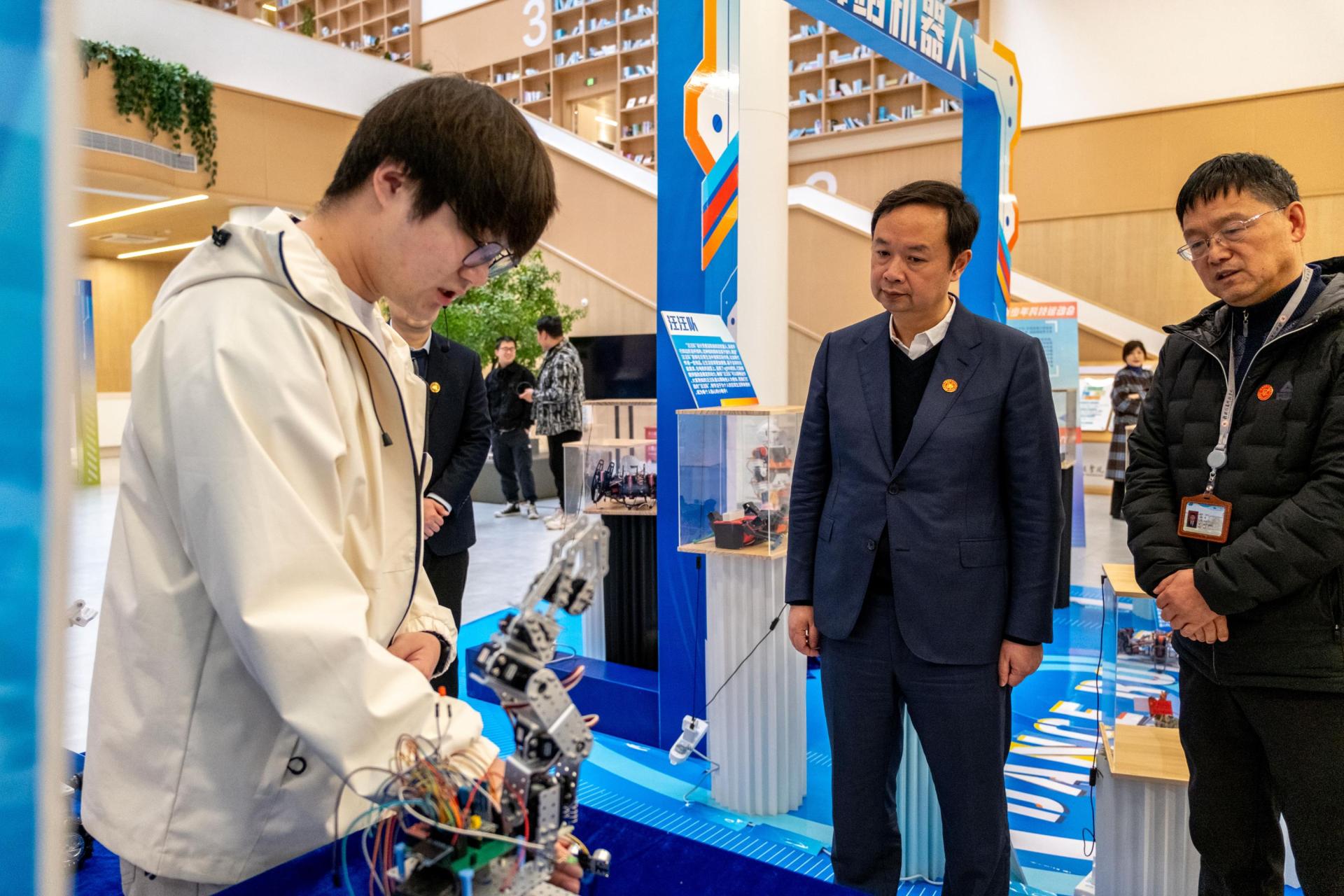为积极响应时代潮流、紧跟AI时代创新步伐,永利集团304am登录于3月11日在知行楼一楼大厅举办了第二届科技文化成果展。此次展览以“科技 科普 科创”为主题,展示了学校在科技创新、人工智能、数字化转型等领域的最新成果。董事长罗欣在创新创业学院相关负责人的陪同下亲临现场,并参观成果展作品。