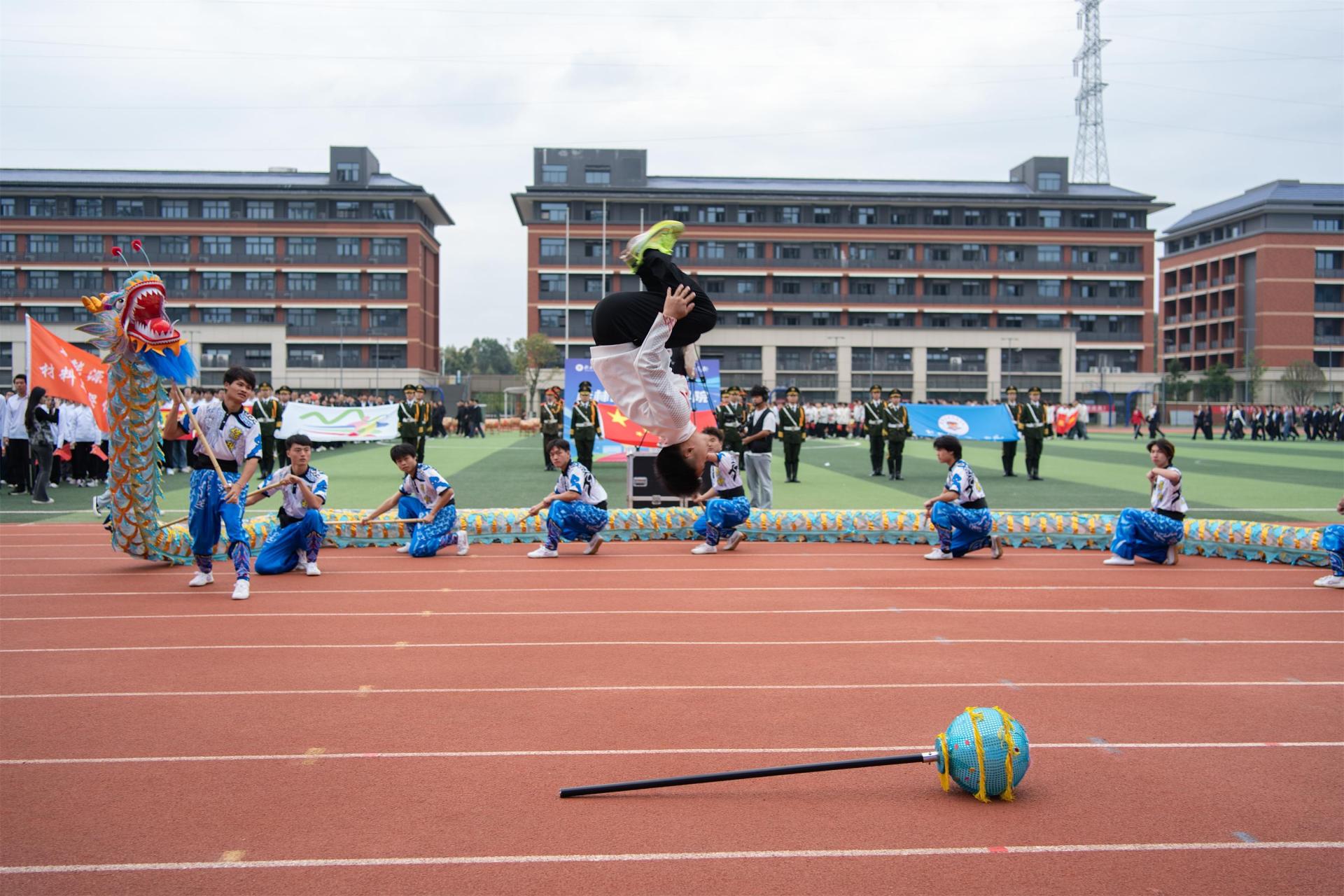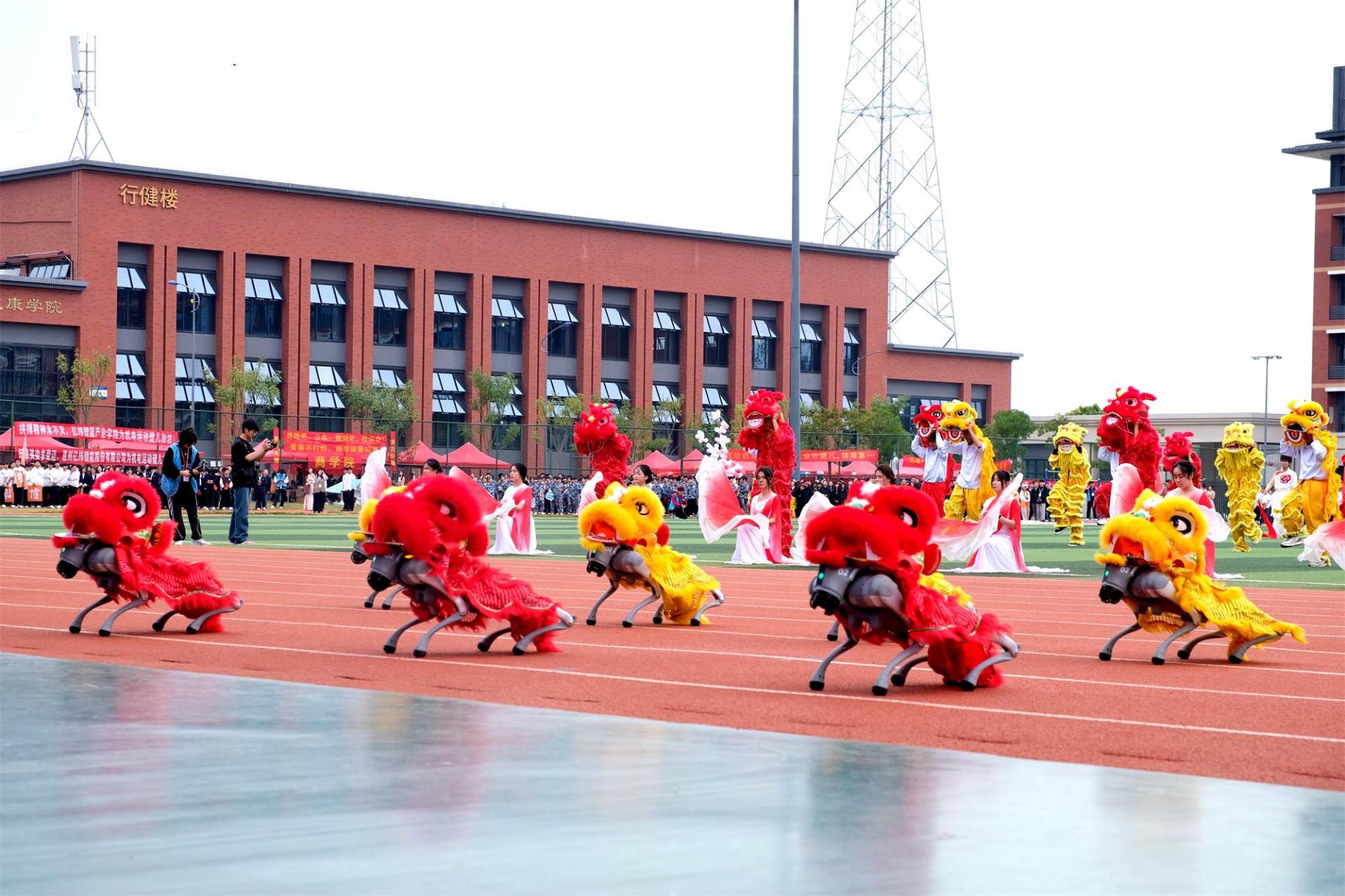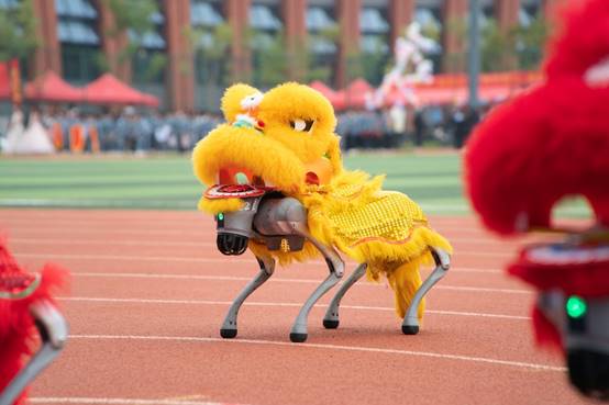 开幕式上,机电工程学院的《时代经纬・科创华章》表演极具亮点。身着舞狮传统服装的机器狗与表演者同台共舞,以利落协作和工业感动作变幻出主题造型,既展现了学科特色,也传递了出科创与时代同行的内涵,瞬间引爆全场掌声。