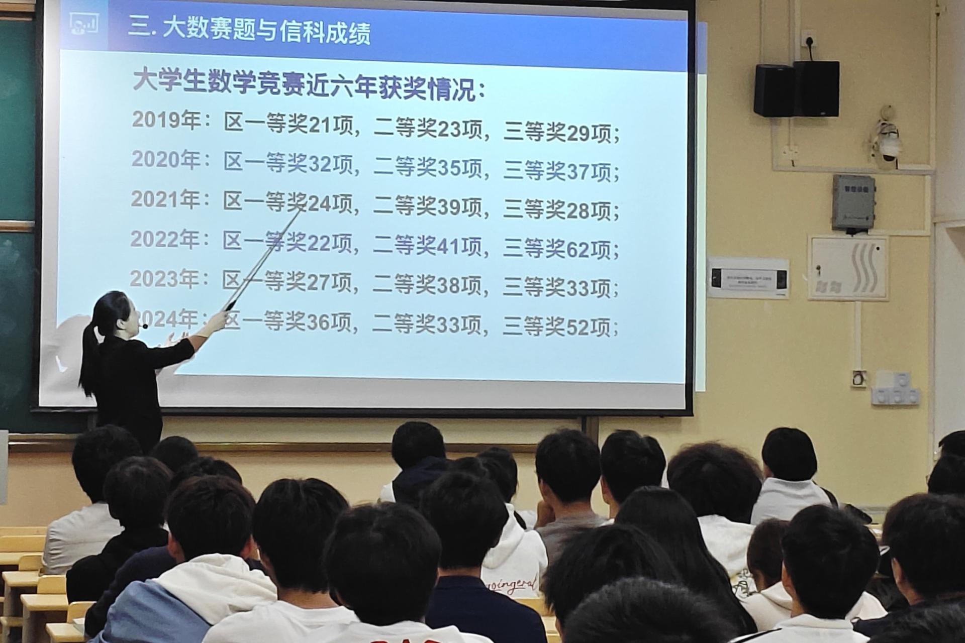 10月30日下午,基础教研部教工党支部书记刘映伶在C305为近120名备战第十七届全国大学生数学竞赛的学生代表作动员。她围绕赛制、指导团队、历年成绩、赛题分析和备考建议五方面进行讲解,鼓励学生:“这是个亲民又易获奖的比赛,认真准备就有收获,还能为考研加分”。