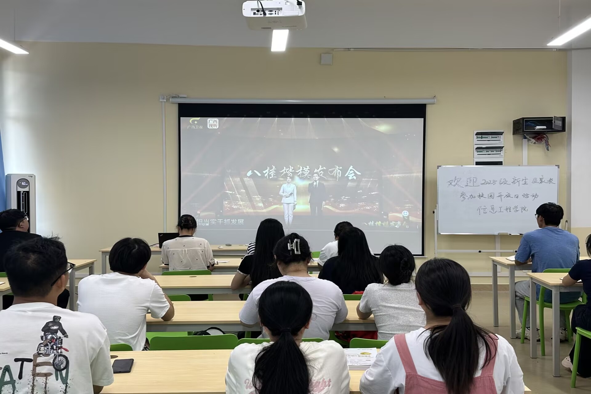 为深入学习贯彻习近平新时代中国特色社会主义思想,认真贯彻落实党的二十大和二十届二中、三中全会精神,贯彻落实习近平总书记关于教育的重要论述和关于广西工作论述的重要要求,大力弘扬社会主义核心价值观,营造崇尚先进、学习先进、争当先进的浓厚氛围,9月1日至5日期间,信息工程学院组织全院师生观看2025年“八桂楷模”先进事迹视频展播,同上一堂“八桂楷模·大思政课”。