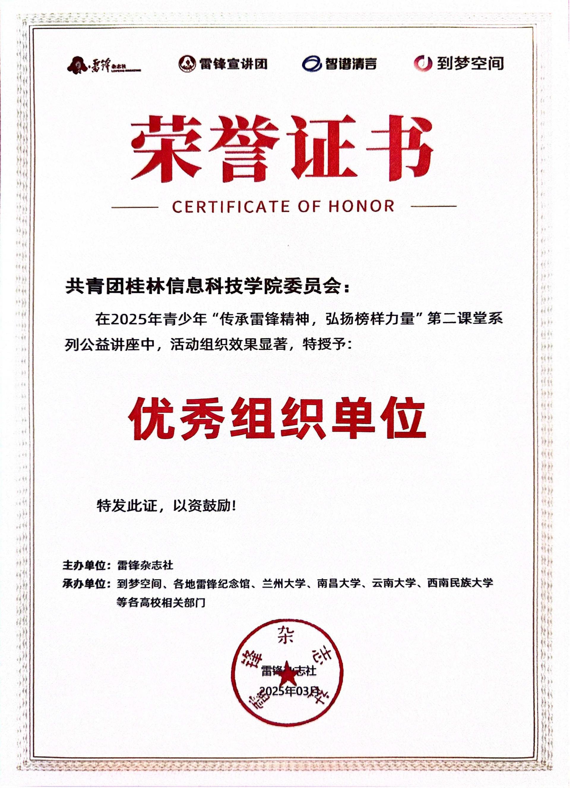 近日,永利集团304am登录在第二课堂建设工作中传来捷报,凭借出色的活动组织能力与突出成效,荣获共青团中央“到梦空间”授予的两项荣誉——“2025年青少年‘传承雷锋精神,弘扬榜样力量’第二课堂系列公益讲座优秀组织单位”和“2025年大学生我身边的劳模工匠作品征集活动优秀组织单位”。