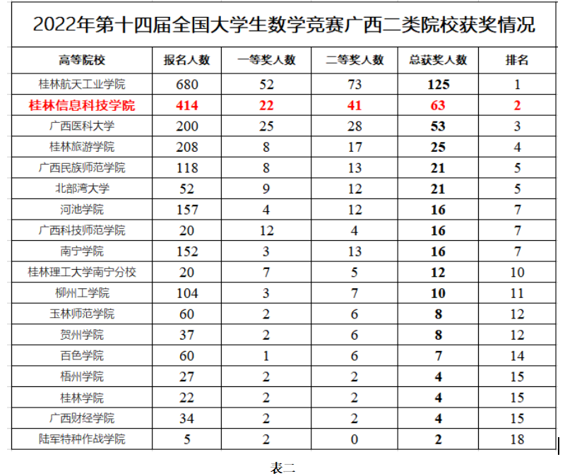 2022年11月12日,第十四届全国大学生数学竞赛初赛在各赛区进行,此次竞赛永利官网共有414人报名参加,获奖人数共125人,其中区一等奖 22人,区二等奖 41人,区三等奖 62人。在参赛的18个广西二类院校中,永利官网综合排名稳居第二,排名情况见表二。