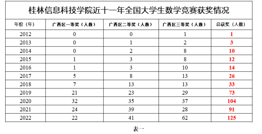 截止到2022年12月,数学教研部教师指导学生参加全国大学生数学竞赛非数学类获奖共计492人,其中区一等奖113人,区二等奖168人,区三等奖211人。特别地,近几年永利官网竞赛成绩突飞猛进,详细获奖情况见表一。